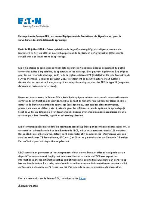 Industriels 10 juillet 2024 - 16:23 Eaton, spécialiste de la gestion énergétique intelligente, annonce le lancement de Sensea.SPK son nouvel Equipement de Contrôle et de Signalisation (ECS) pour la surveillance des installations de sprinklage. PDF (150 Ko) Télécharger