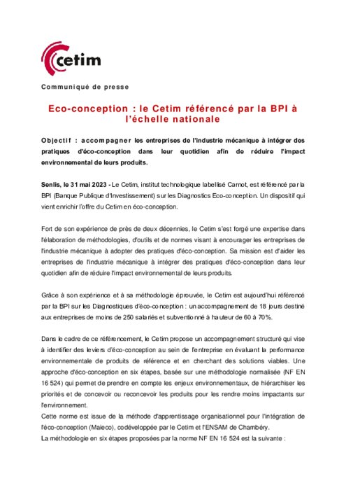 Le Cetim, institut technologique labellisé Carnot, est référencé par la BPI (Banque Publique d'Investissement) sur les Diagnostics Eco-conception. Un dispositif qui vient enrichir l'offre du Cetim en éco-conception.