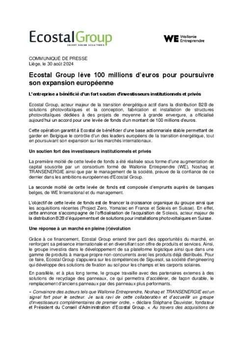 Ecostal Group, acteur majeur de la transition énergétique actif dans la distribution B2B de solutions photovoltaïques et la conception, fabrication et installation de structures photovoltaïques dédiées à des projets de moyenne à grande envergure, a officialisé aujourd’hui un accord pour une levée de fonds d’un montant de 100 millions d’euros.