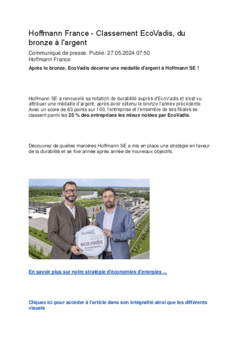 EcoVadis décerne une médaille d'argent à Hoffmann SE