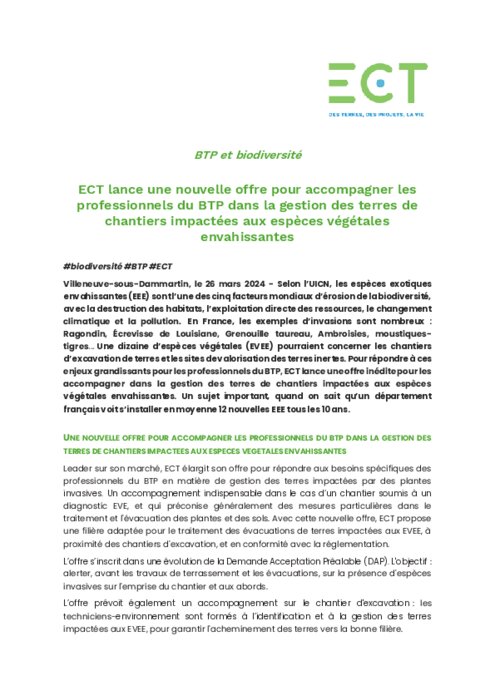 Leader sur son marché, ECT élargit son offre pour répondre aux besoins spécifiques des professionnels du BTP en matière de gestion des terres impactées par des plantes invasives. Un accompagnement indispensable dans le cas d’un chantier soumis à un diagnostic EVE, et qui préconise généralement des mesures particulières dans le traitement et l'évacuation des plantes et des sols. Avec cette nouvelle offre, ECT propose une filière adaptée pour le traitement des évacuations de terres impactées aux EVEE, à proximité des chantiers d'excavation, et en conformité avec la réglementation.