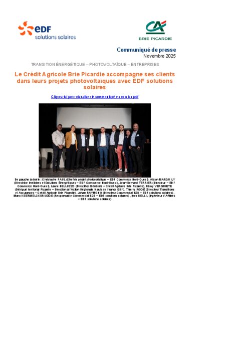 Conscient de la nécessité de soutenir ses clients professionnels dans leur transition énergétique, le Crédit Agricole Brie Picardie s’associe à EDF solutions solaires, pionnier de l’autoconsommation photovoltaïque en France, afin de les accompagner de A à Z dans leurs projets d’installation photovoltaïque.