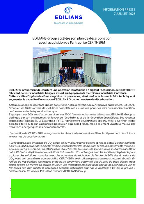 EDILIANS Group vient de conclure une opération stratégique en signant l’acquisition de CERITHERM, fabricant de fours industriels français, expert en équipements thermiques industriels innovants. Cette société d’ingénierie d’une vingtaine de personnes, vient renforcer le savoir faire technique et augmenter la capacité d’innovation d’EDILIANS Group en matière de décarbonation.
