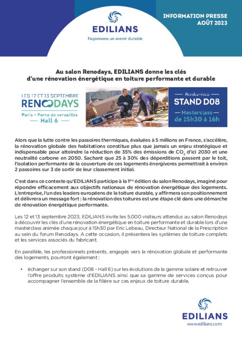 EDILIANS participe à la 1ère édition du salon Renodays, imaginé pour répondre efficacement aux objectifs nationaux de rénovation énergétique des logements. L’entreprise, l’un des leaders européens de la toiture durable, y affirmera son positionnement et délivrera un message fort.