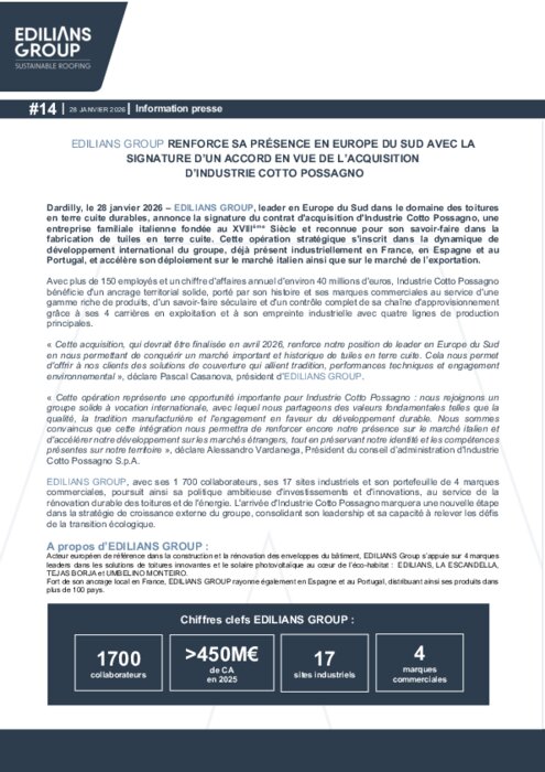 EDILIANS GROUP, leader en Europe du Sud dans le domaine des toitures en terre cuite durables, annonce la signature du contrat d'acquisition d'Industrie Cotto Possagno, une entreprise familiale italienne fondée au XVIIIème Siècle et reconnue pour son savoir-faire dans la fabrication de tuiles en terre cuite. Cette opération stratégique s'inscrit dans la dynamique de développement international du groupe, déjà présent industriellement en France, en Espagne et au Portugal, et accélère son déploiement sur le marché italien ainsi que sur le marché de l’exportation.