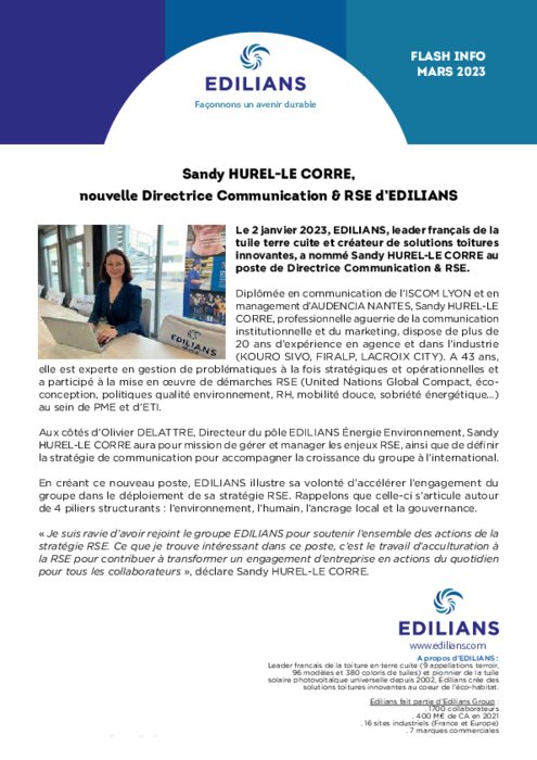 Industriels 06 mars 2023 - 10:57 Edilians, leader français de la tuile terre cuite et créateur de solutions toitures innovantes, vient de confirmer la nomination de Sandy HUREL-LE CORRE au poste de Directrice Communication & RSE. PDF (64 Ko) Télécharger