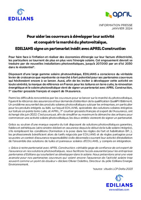 Disposant d’une large gamme solaire photovoltaïque, Edilians a conscience du véritable levier de croissance que représente ce marché à fort potentiel pour ses partenaires couvreurs qui hésiteraient encore à se lancer. Aussi, afin de les inciter à développer cette activité en toute sérénité, la marque de référence en France pour les toitures en terre cuite, la rénovation énergétique et le solaire photovoltaïque vient de signer un partenariat avec April Construction, 1er courtier grossiste français et expert de l’Assurance.