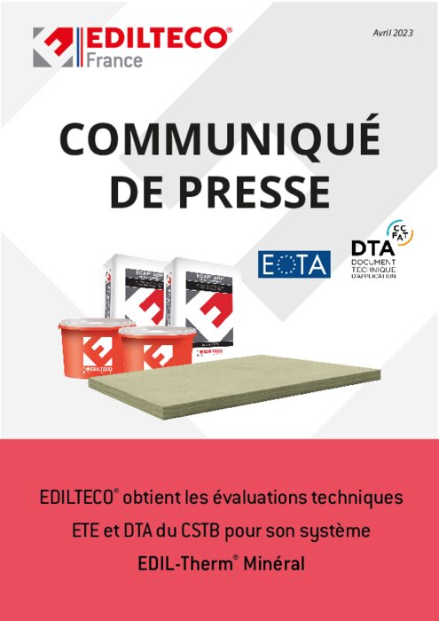 Industriels 14 avril 2023 - 13:35 Suite à l’obtention en novembre 2022 de l’Evaluation Technique Européenne suivant l’EAD 040083-00-0404, EDILTECO obtient à présent son DTA pour son système d’isolation extérieure, EDIL-Therm Minéral. PDF (2 Mo) Télécharger