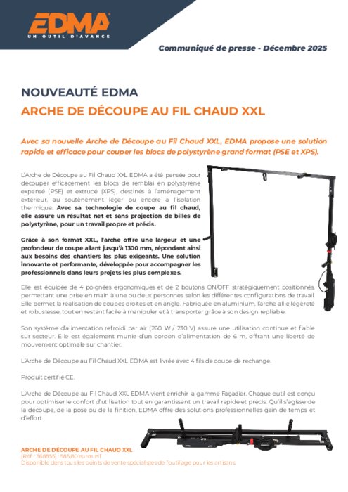 L’Arche de Découpe au Fil Chaud XXL EDMA a été pensée pour découper efficacement les blocs de remblai en polystyrène expansé (PSE) et extrudé (XPS), destinés à l’aménagement extérieur, au soutènement léger ou encore à l’isolation thermique. Avec sa technologie de coupe au fil chaud, elle assure un résultat net et sans projection de billes de polystyrène, pour un travail propre et précis.