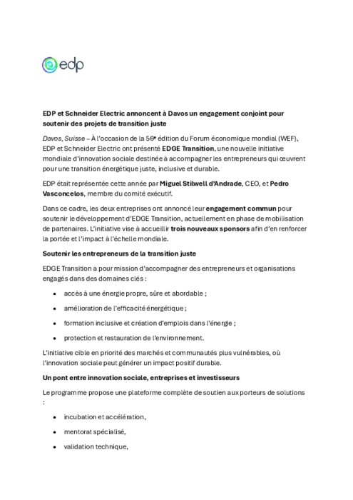 À l’occasion de la 56ᵉ édition du Forum économique mondial (WEF), EDP et Schneider Electric ont présenté EDGE Transition, une nouvelle initiative mondiale d’innovation sociale destinée à accompagner les entrepreneurs qui œuvrent pour une transition énergétique juste, inclusive et durable.