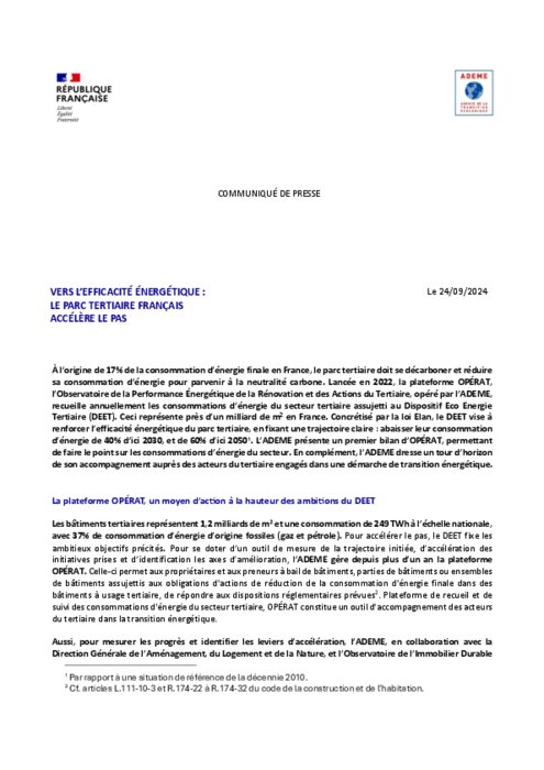 Lancée en 2022, la plateforme OPÉRAT, l’Observatoire de la Performance Énergétique de la Rénovation et des Actions du Tertiaire, opéré par l’ADEME, recueille annuellement les consommations d’énergie du secteur tertiaire assujetti au Dispositif Eco Energie Tertiaire (DEET). Ceci représente près d’un milliard de m2 en France. Concrétisé par la loi Elan, le DEET vise à renforcer l’efficacité énergétique du parc tertiaire, en fixant une trajectoire claire : abaisser leur consommation d’énergie de 40% d’ici 2030, et de 60% d’ici 2050. L’ADEME présente un premier bilan d’OPÉRAT, permettant de faire le point sur les consommations d’énergie du secteur.