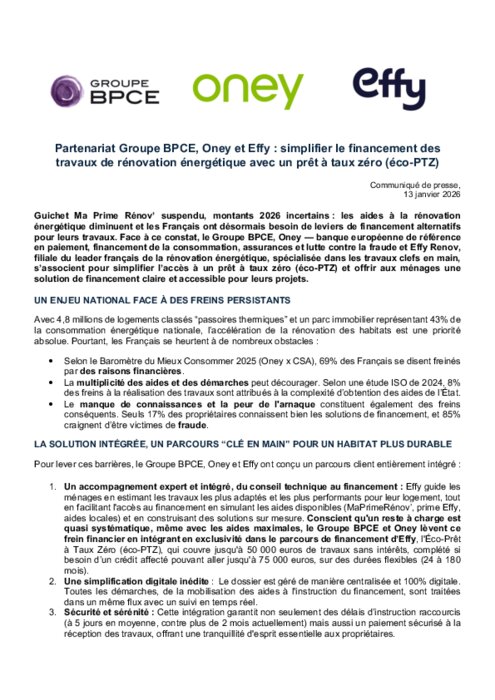 Guichet MaPrimeRénov’ suspendu, montants 2026 incertains : les aides à la rénovation énergétique diminuent et les Français ont désormais besoin de leviers de financement alternatifs pour leurs travaux. Face à ce constat, le Groupe BPCE, Oney (banque européenne de référence en paiement, financement de la consommation, assurances et lutte contre la fraude) et Effy Renov, filiale du leader français de la rénovation énergétique, spécialisée dans les travaux clefs en main, s’associent pour simplifier l’accès à un prêt à taux zéro (éco-PTZ) et offrir aux ménages une solution de financement claire et accessible pour leurs projets.