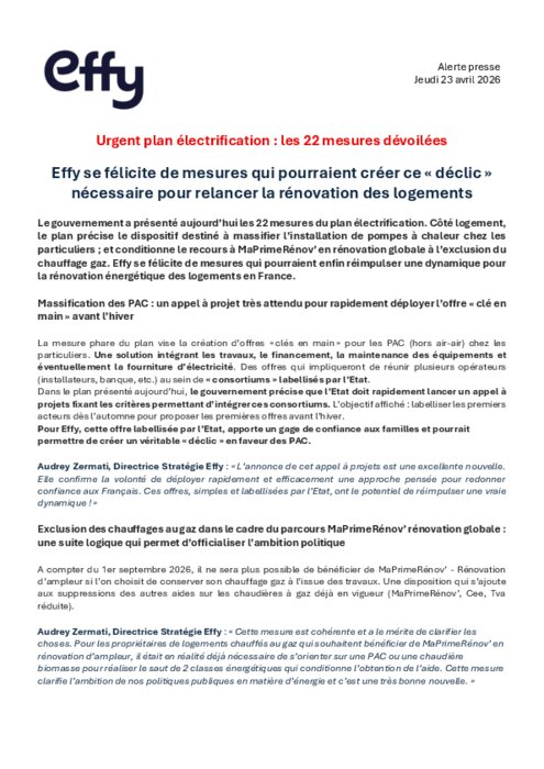 Le gouvernement a présenté aujourd’hui les 22 mesures du plan électrification. Côté logement, le plan précise le dispositif destiné à massifier l’installation de pompes à chaleur chez les particuliers; et conditionne le recours à MaPrimeRénov’ en rénovation globale à l’exclusion du chauffage gaz. Effy se félicite de mesures qui pourraient enfin réimpulser une dynamique pour la rénovation énergétique des logements en France.