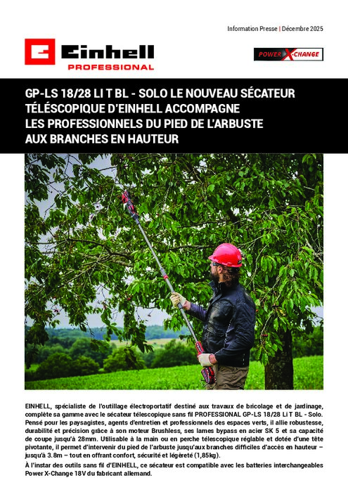 EINHELL, spécialiste de l’outillage électroportatif destiné aux travaux de bricolage et de jardinage, complète sa gamme avec le sécateur télescopique sans fil PROFESSIONAL GP-LS 18/28 Li T BL - Solo. Pensé pour les paysagistes, agents d’entretien et professionnels des espaces verts, il allie robustesse, durabilité et précision grâce à son moteur Brushless, ses lames bypass en acier SK 5 et sa capacité de coupe jusqu’à 28 mm. Utilisable à la main ou en perche télescopique réglable et dotée d’une tête pivotante, il permet d’intervenir du pied de l’arbuste jusqu’aux branches difficiles d’accès en hauteur – jusqu’à 3,8 m – tout en offrant confort, sécurité et légèreté (1,85 kg).