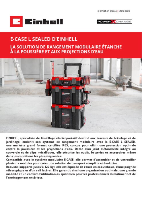EINHELL, spécialiste de l’outillage électroportatif destiné aux travaux de bricolage et de jardinage, enrichit son système de rangement modulaire avec la E-CASE L SEALED, une mallette grand format certifiée IP65, conçue pour offrir une protection optimale contre la poussière et les projections d’eau. Dotée d’un joint d’étanchéité intégré au couvercle et de clips métalliques, elle sécurise les outils, batteries et accessoires même dans les conditions les plus exigeantes.