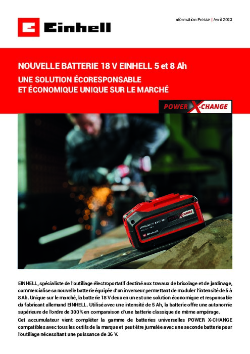 EINHELL, spécialiste de l’outillage électroportatif destiné aux travaux de bricolage et de jardinage, commercialise sa nouvelle batterie équipée d’un inverseur permettant de moduler l’intensité de 5 à 8 Ah. Unique sur le marché, la batterie 18 V deux en un est une solution économique et responsable du fabricant allemand EINHELL. Utilisé avec une intensité de 5 Ah, la batterie offre une autonomie supérieure de l’ordre de 300% en comparaison d’une batterie classique de même ampérage.
