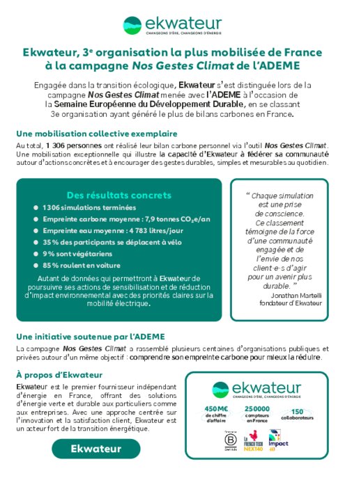 Au total, 1 306 personnes ont réalisé leur bilan carbone personnel via l’outil "Nos Gestes Climat". Une mobilisation exceptionnelle qui illustre la capacité d’Ekwateur à fédérer sa communauté autour d’actions concrètes et à encourager des gestes durables, simples et mesurables au quotidien.