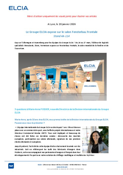 Services 23 février 2026 - 12:42 Cap sur l’Allemagne et Nuremberg pour les équipes du Groupe ELCIA ! Du 24 au 27 mars, l’éditeur de logiciels spécialisés Menuiserie, Store, Fermeture expose sur Fensterbau Frontale, le salon mondial de la fenêtre et de l’ouverture. PDF (468 Ko) Télécharger