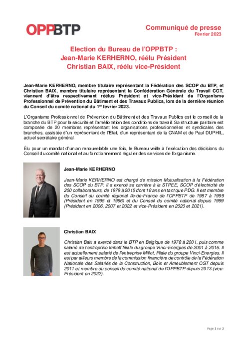 Jean-Marie KERHERNO, membre titulaire représentant la Fédération des SCOP du BTP, et Christian BAIX, membre titulaire représentant la Confédération Générale du Travail CGT, viennent d’être respectivement réélus Président et vice-Président de l’Organisme Professionnel de Prévention du Bâtiment et des Travaux Publics, lors de la dernière réunion du Conseil du comité national du 1er février 2023.
