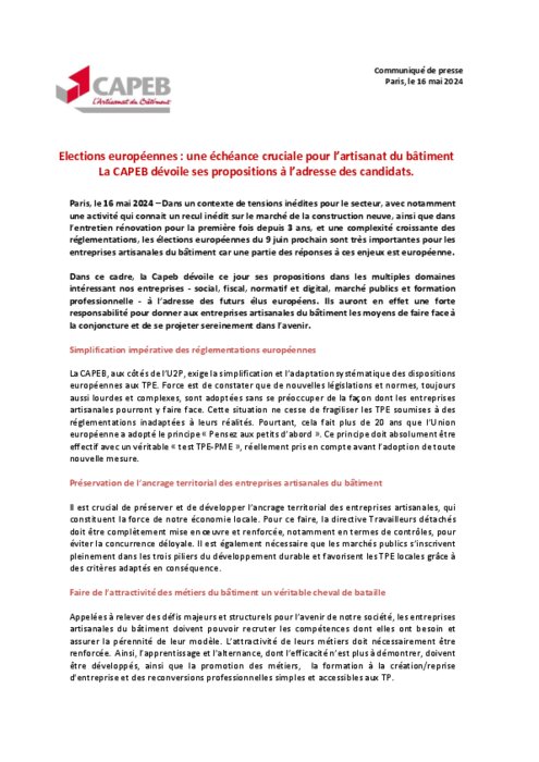 La Capeb dévoile ce jour ses propositions à destination des candidats aux élections européennes. L'organisation professionnelle estime qu'ils auront une forte responsabilité pour donner aux entreprises artisanales du bâtiment les moyens de faire face à la conjoncture et de se projeter sereinement dans l’avenir.