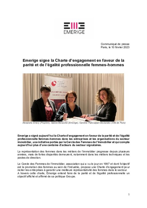Emerige a signé aujourd’hui la Charte d’engagement en faveur de la parité et de l’égalité professionnelle femmes-hommes dans les entreprises et les organisations du secteur immobilier, une initiative portée par le Cercle des Femmes de l’Immobilier et qui compte aujourd’hui plus d’une centaine d’acteurs du secteur signataires.