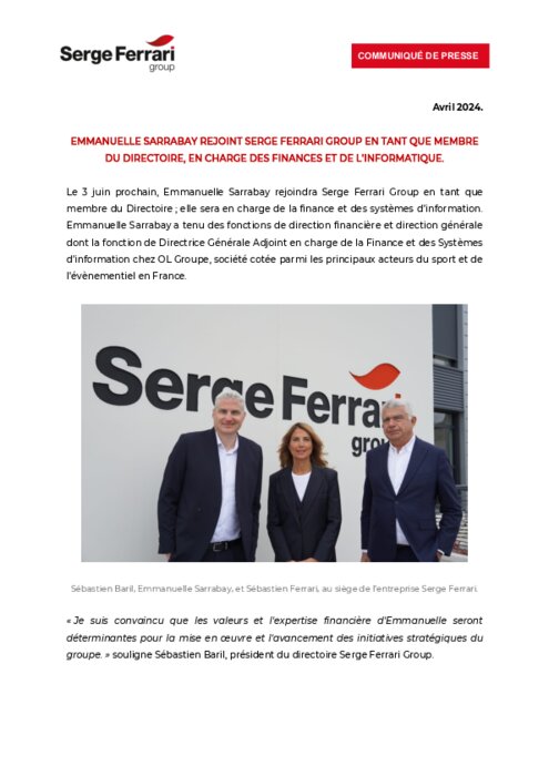 Le 3 juin prochain, Emmanuelle Sarrabay rejoindra Serge Ferrari Group en tant que membre du Directoire ; elle sera en charge de la finance et des systèmes d’information. Emmanuelle Sarrabay a tenu des fonctions de direction financière et direction générale dont la fonction de Directrice Générale Adjoint en charge de la Finance et des Systèmes d’information chez OL Groupe, société cotée parmi les principaux acteurs du sport et de l’évènementiel en France.