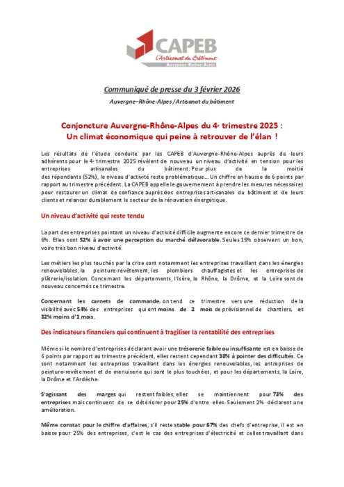 Les résultats de l’étude conduite par les CAPEB d’Auvergne-Rhône-Alpes auprès de leurs adhérents pour le 4e trimestre 2025 révèlent de nouveau un niveau d’activité en tension pour les entreprises artisanales du bâtiment. Pour plus de la moitié des répondants (52 %), le niveau d’activité reste problématique… Un chiffre en hausse de 6 points par rapport au trimestre précédent. La CAPEB appelle le gouvernement à prendre les mesures nécessaires pour restaurer un climat de confiance auprès des entreprises artisanales du bâtiment et de leurs clients et relancer durablement le secteur de la rénovation énergétique.