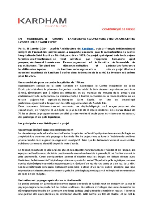 Le pôle Architecture de Kardham, acteur français indépendant et intégré de l’immobilier professionnel, a remporté le marché pour la reconstruction du Centre Hospitalier de Saint Esprit en Martinique créé en 1853. Ce projet, qui répond à de forts enjeux territoriaux et fonctionnels, se veut novateur par l’approche humaniste qu’il propose, résolument tournée vers l’accompagnement et le bien-être de l’ensemble de ses utilisateurs. Témoin d’une démarche collective et partenariale forte entre les différentes équipes de Kardham en hexagone et sur site, ce projet illustre à nouveau l’excellence de Kardham à opérer dans le domaine de la santé. La livraison est prévue pour fin 2026.