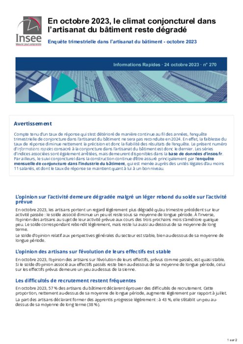 En octobre 2023, les artisans portent un regard légèrement plus dégradé qu’au trimestre précédent sur leur activité passée : le solde associé diminue un peu et reste sous sa moyenne de longue période. À l’inverse, l’opinion des artisans au sujet de leur activité prévue aux cours des trois prochains mois s’améliore quelque peu. Le solde correspondant rebondit légèrement, mais reste lui aussi au-dessous de sa moyenne de long terme.