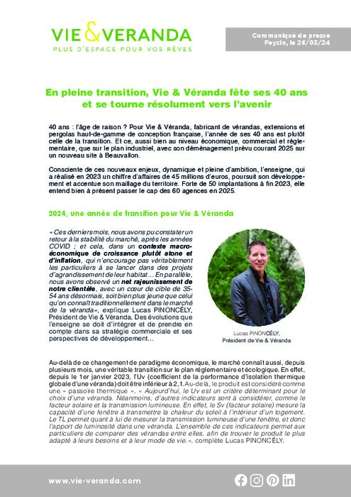 40 ans : l’âge de raison ? Pour Vie & Véranda, fabricant de vérandas, extensions et pergolas haut-de-gamme de conception française, l’année de ses 40 ans est plutôt celle de la transition. Et ce, aussi bien au niveau économique, commercial et réglementaire, que sur le plan industriel, avec son déménagement prévu courant 2025 sur un nouveau site à Beauvallon.