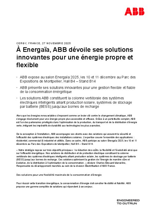 Alors que les énergies renouvelables s’imposent comme un levier clé contre le changement climatique, ABB s’engage résolument pour une énergie propre plus accessible et efficace. Grâce à un portefeuille complet, ABB est l’un des partenaires privilégiés dans l'optimisation de la production, du transport et de la distribution d'énergie verte, intégrant les impératifs de durabilité aux technologies les plus avancées.