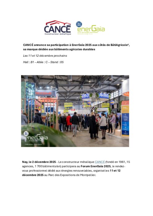 Aux côtés de sa marque BâtiAgricole, lancée récemment pour structurer son expertise historique dans le bâtiment agricole, Cancé présentera ses solutions destinées aux exploitants, investisseurs photovoltaïques et acteurs engagés dans la transition énergétique.