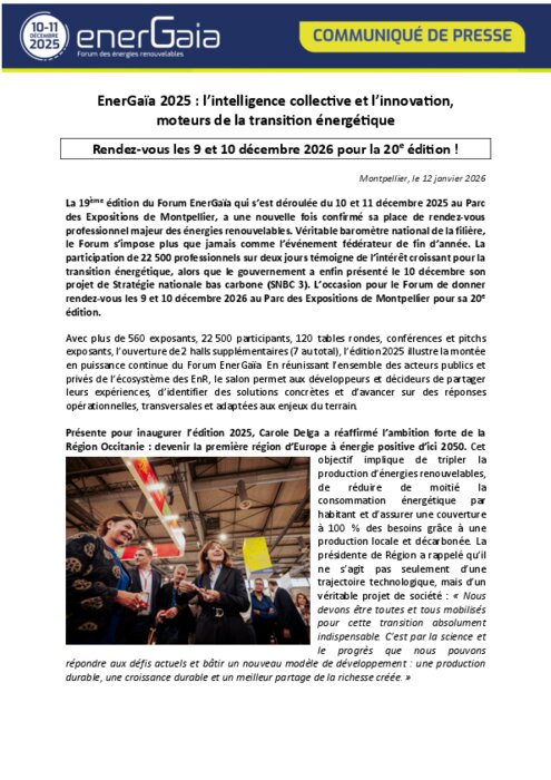 La 19e édition du Forum EnerGaïa qui s’est déroulée du 10 et 11 décembre 2025 au Parc des Expositions de Montpellier, a une nouvelle fois confirmé sa place de rendez-vous professionnel majeur des énergies renouvelables. Véritable baromètre national de la filière, le Forum s’impose plus que jamais comme l’événement fédérateur de fin d’année. La participation de 22 500 professionnels sur deux jours témoigne de l’intérêt croissant pour la transition énergétique, alors que le gouvernement a enfin présenté le 10 décembre son projet de Stratégie nationale bas carbone (SNBC 3). L’occasion pour le Forum de donner rendez-vous les 9 et 10 décembre 2026 au Parc des Expositions de Montpellier pour sa 20e édition.