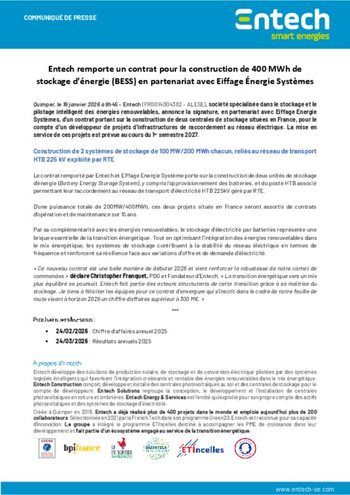 Le contrat remporté par Entech et Eiffage Energie Système porte sur la construction de deux unités de stockage d’énergie (Battery Energy Storage System), y compris l’approvisionnement des batteries, et du poste HTB associé permettant leur raccordement au réseau de transport d’électricité HTB 225kV géré par RTE.