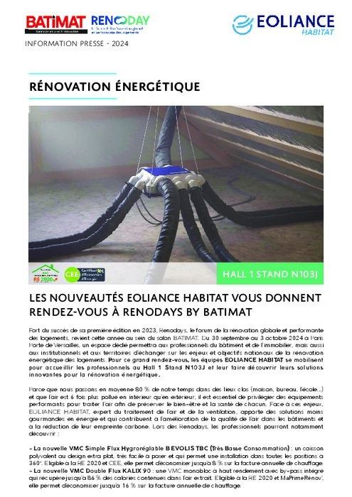 Industriels 27 août 2024 - 10:55 Pour ce grand rendez-vous, les équipes EOLIANCE HABITAT se mobilisent pour accueillir les professionnels au Hall 1 Stand N103J et leur faire découvrir leurs solutions innovantes pour la rénovation énergétique. PDF (2 Mo) Télécharger