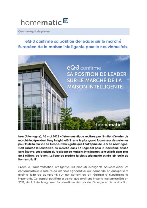 Selon une étude réalisée par l’institut d’études de marché indépendant Berg Insight, eQ-3 reste le plus grand fournisseur de systèmes pour toute la maison en Europe. Cela signifie que l’entreprise de Leer en Allemagne, s’est assurée le leadership du marché dans ce segment pour la neuvième année consécutive. Les produits du fabricant de maisons intelligentes sont utilisés dans plus de 3 millions de foyers. La ligne de produits la plus performante est de loin celle de Homematic IP.