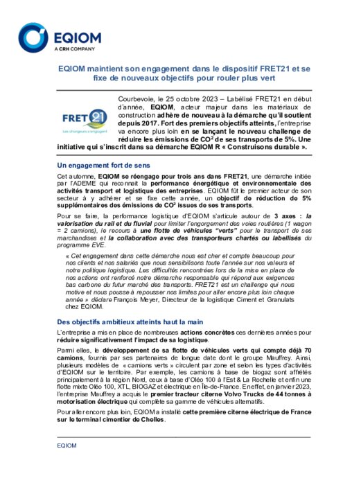 Labélisé FRET21 en début d’année, EQIOM, acteur majeur dans les matériaux de construction adhère de nouveau à la démarche qu’il soutient depuis 2017. Fort des premiers objectifs atteints, l’entreprise va encore plus loin en se lançant le nouveau challenge de réduire les émissions de CO2 de ses transports de 5%. Une initiative qui s’inscrit dans sa démarche EQIOM R « Construisons durable ».