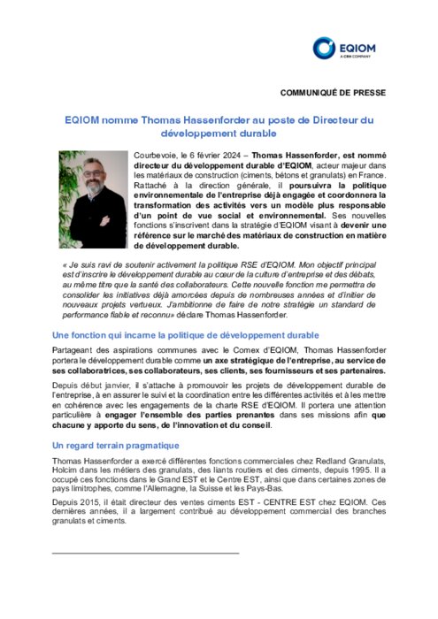 Thomas Hassenforder, est nommé directeur du développement durable d’EQIOM, acteur majeur dans les matériaux de construction (ciments, bétons et granulats) en France. Rattaché à la direction générale, il poursuivra la politique