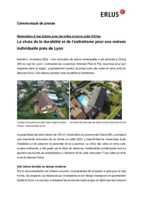 Une rénovation de toiture remarquable a été achevée à Charly (69) au sud de Lyon. L’entreprise de couverture Antoniali Père & Fils, reconnue pour son expertise dans la région, a parfaitement conduit ce projet avec des tuiles en terre cuite du fabricant Erlus. Une alliance parfaite entre durabilité et esthétisme.