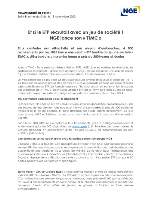 Pour conforter son attractivité et son niveau d’embauches, 4 000 recrutements par an, NGE lance une version BTP inédite du jeu de société « TTMC », diffusée dans un premier temps à près de 200 lycées et écoles.