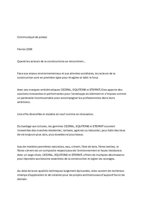 Industriels 05 février 2026 - 10:30 Avec ses marques emblématiques Cedral, Equitone et Eternit, Etex apporte des solutions innovantes et performantes pour l'enveloppe du bâtiment et s’impose comme un partenaire incontournable pour accompagner les professionnels dans leurs ambitions. PDF (31 Ko) Télécharger