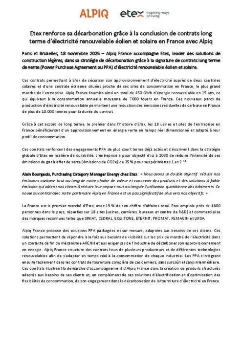 Alpiq France accompagne Etex, leader des solutions de construction légères, dans sa stratégie de décarbonation grâce à la signature de contrats long terme de vente (Power Purchase Agreement ou PPA) d’électricité renouvelable éolien et solaire.