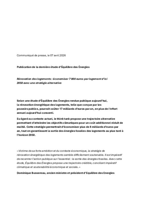 Institutionnels 07 avril 2026 - 13:30 Selon une étude d’Équilibre des Énergies rendue publique, la rénovation énergétique des logements, telle que conçue par les pouvoirs publics, pourrait coûter 17 milliards d’euros par an, en plus de l’effort annuel aujourd’hui consenti. PDF (125 Ko) Télécharger credit Ednen