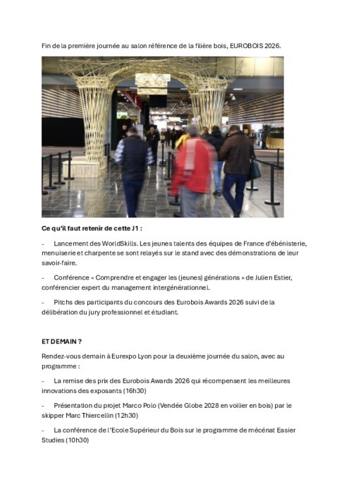 Lancement des WorldSkills. Les jeunes talents des équipes de France d’ébénisterie, menuiserie et charpente se sont relayés sur le stand avec des démonstrations de leur savoir-faire. Conférence « Comprendre et engager les (jeunes) générations » de Julien Estier, conférencier expert du management intergénérationnel. Pitchs des participants du concours des Eurobois Awards 2026 suivi de la délibération du jury professionnel et étudiant.