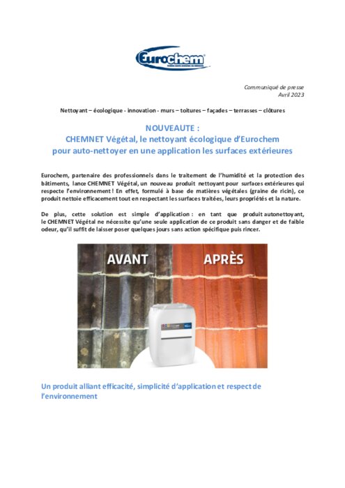 Eurochem, partenaire des professionnels dans le traitement de l’humidité et la protection des bâtiments, lance CHEMNET Végétal, un nouveau produit nettoyant pour surfaces extérieures qui respecte l’environnement ! En effet, formulé à base de matières végétales (graine de ricin), ce produit nettoie efficacement tout en respectant les surfaces traitées, leurs propriétés et la nature.