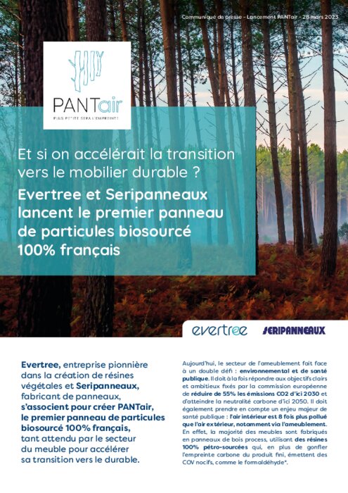 Evertree, entreprise pionnière dans la création de résines végétales et Seripanneaux, spécialiste de la fabrication de panneaux de particules, apportent une solution concrète à tous les industriels de l’ameublement avec le premier panneau de particules biosourcé 100% français, sans formaldéhyde chimique ni isocyanate et à l’empreinte carbone limitée.