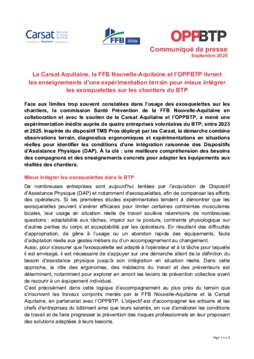 Face aux limites trop souvent constatées dans l’usage des exosquelettes sur les chantiers, la commission Santé Prévention de la FFB Nouvelle-Aquitaine en collaboration et avec le soutien de la Carsat Aquitaine et l’OPPBTP, a mené une expérimentation inédite auprès de quatre entreprises volontaires du BTP, entre 2023 et 2025. Inspirée du dispositif TMS Pros déployé par les Carsat, la démarche combine observations terrain, diagnostics ergonomiques et expérimentations en situations réelles pour identifier les conditions d’une intégration raisonnée des Dispositifs d’Assistance Physique (DAP). À la clé : une meilleure compréhension des besoins des compagnons et des enseignements concrets pour adapter les équipements aux réalités des chantiers.