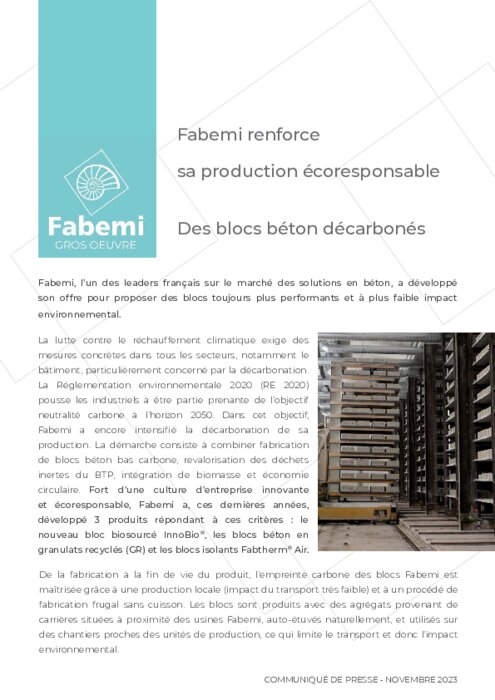 Industriels 28 novembre 2023 - 11:28 Fabemi, l’un des leaders français sur le marché des solutions en béton, a développé son offre pour proposer des blocs toujours plus performants et à plus faible impact environnemental. PDF (665 Ko) Télécharger