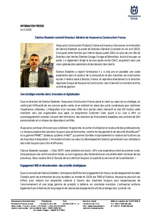 Husqvarna Construction Products France est heureux d'annoncer la nomination de Fabrice Stoeblen au poste de Directeur Général à compter du 1er avril 2025. Il occupait cette fonction par intérim depuis juillet 2024, en plus de son rôle de Directeur des Ventes Directes Sciage, Forage et Démolition. Avant d'occuper ce poste, il a également dirigé le service après-vente (SAV), acquérant ainsi une vision globale des opérations et des besoins des clients.