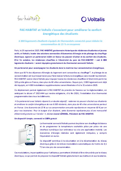 FAC-HABITAT, gestionnaire historique de résidences étudiantes et jeunes actifs, et Voltalis, leader des solutions connectées d’économies d’énergie et de pilotage du chauffage électrique, signent un partenariat inédit en faveur du pouvoir d’achat et du confort des étudiants. D’ici fin octobre, les résidences chauffées à l’électricité du parc de FAC-HABITAT – soit 6 000 logements étudiants – seront équipées gratuitement du thermostat connecté Voltalis.